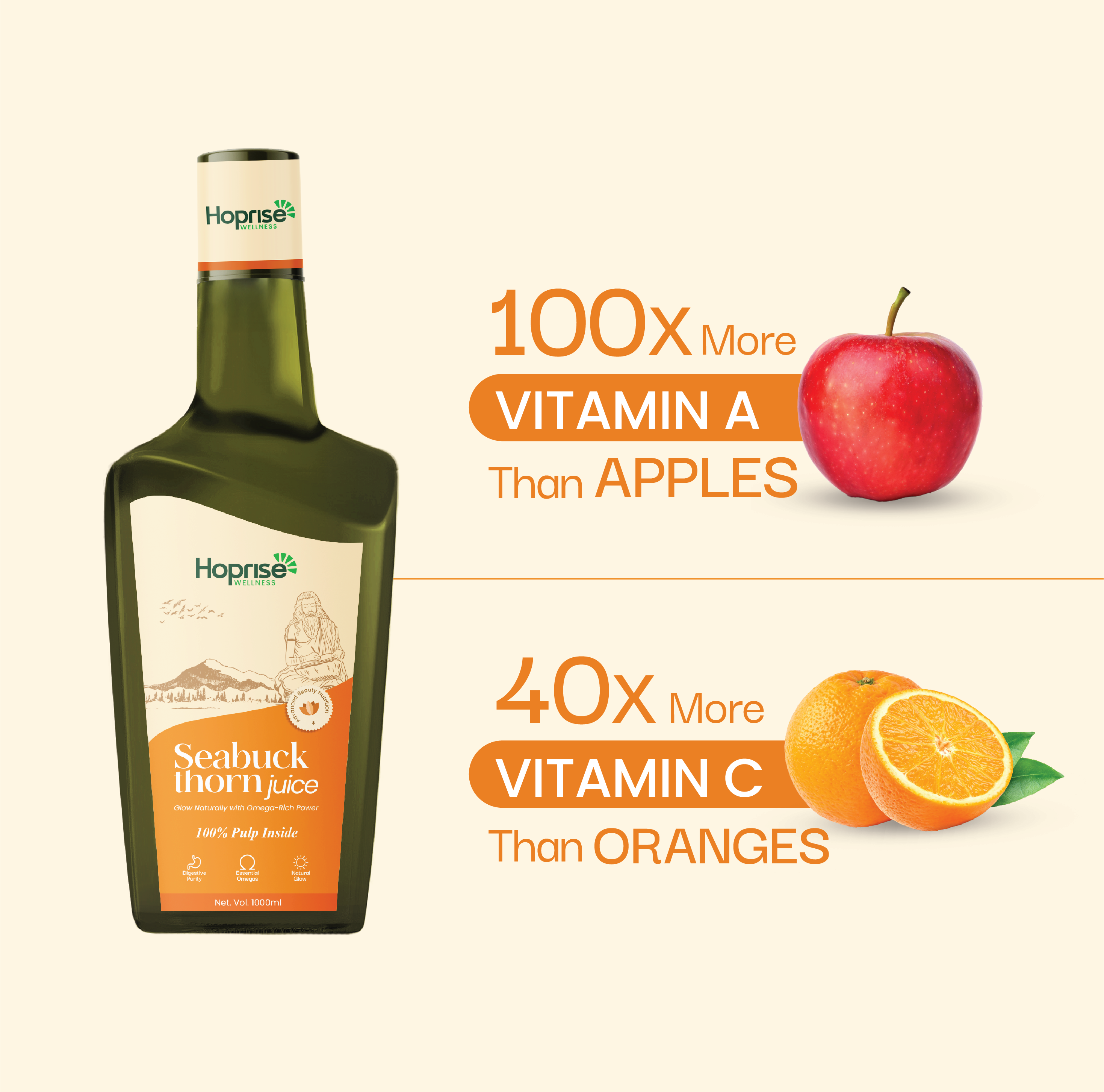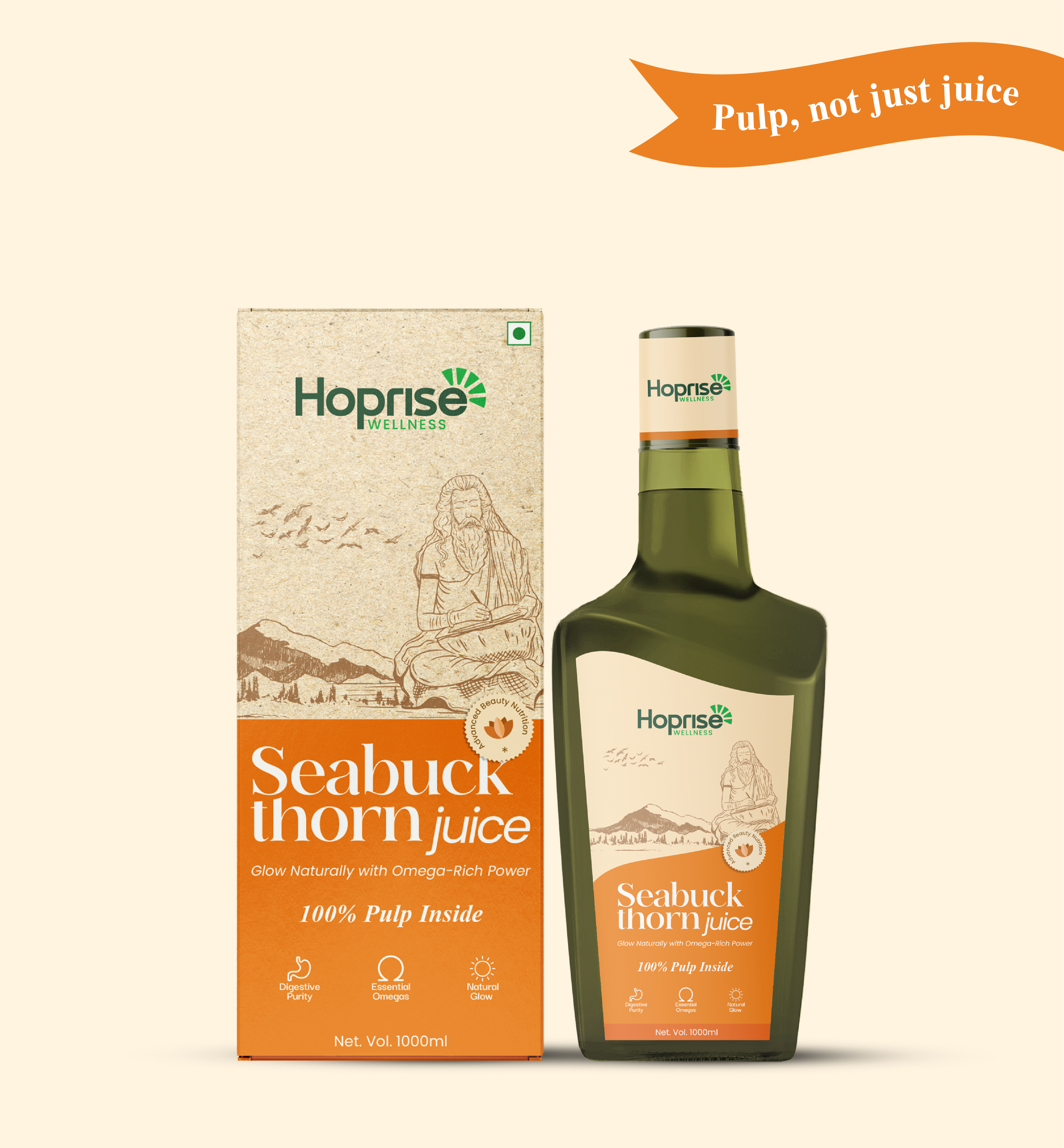 Seabuckthorn juice is packed with over 190 bioactive compounds, rich in Vitamin C, Omega 3-6-7-9, and antioxidants. It helps boost immunity, supports heart health, improves digestion, and promotes healthy skin and hair.